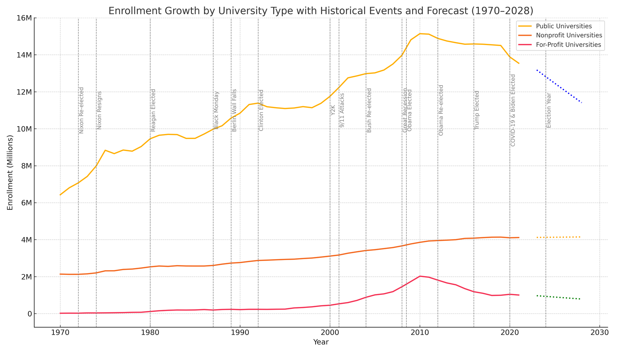 The chart below tells the tale: from 1970 to 2022, U.S. college enrollment was like a buffet plate at Golden Corralâalways room for more. Public universities led the charge, piling on students year after year. Private nonprofits followed like cautious middle children. For-profits⌠well, they sprinted in like theyâd discovered a cheat code, only to get caught and tumble hard.